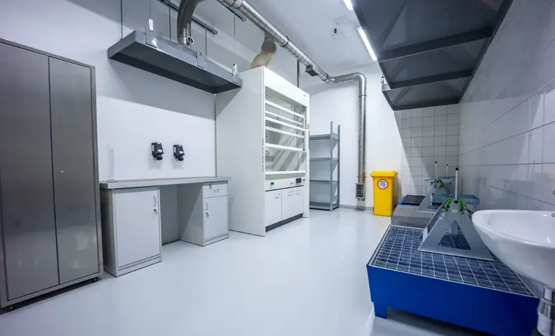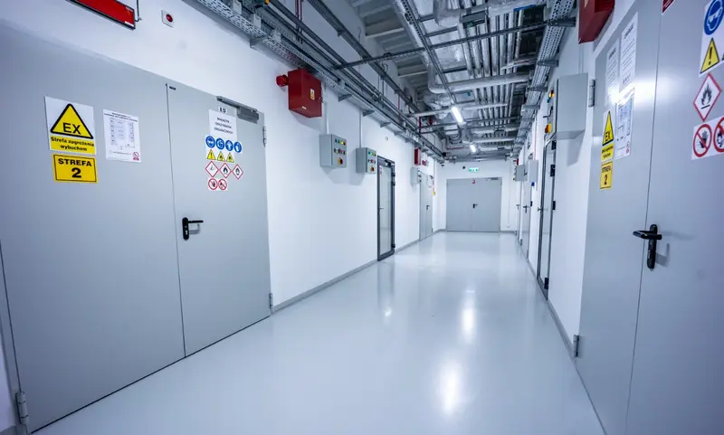 Każde pomieszczenie połączone jest z przedsionkiem bezpieczeństwa wyposażonym w prysznic bezpieczeństwa i oczomyjkę. Rozwiązanie to umożliwia szybką reakcję w sytuacjach awaryjnych i znacząco podnosi poziom ochrony pracowników.