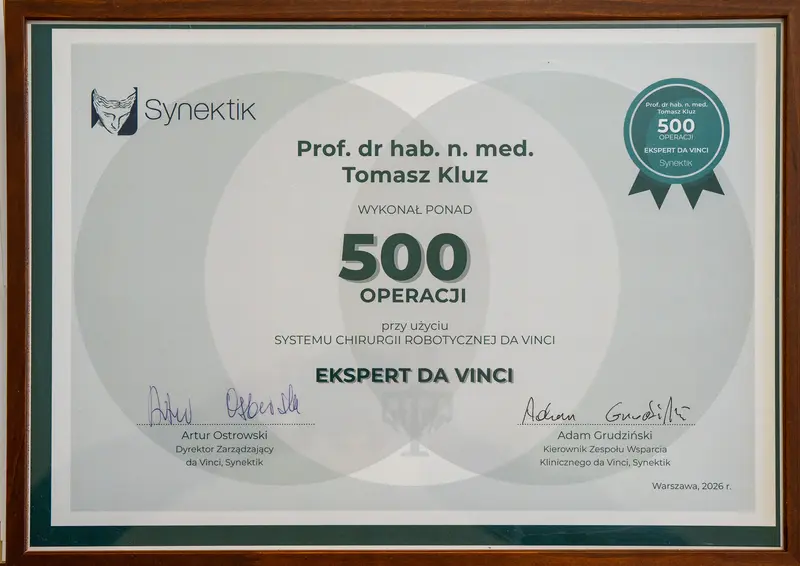 Pierwszą samodzielną operację z wykorzystaniem systemu robotycznego prof. Tomasz Kluz przeprowadził w 2023 roku. Zakres wykonywanych przez niego procedur obejmuje m.in. operacje usunięcia macicy i węzłów chłonnych u pacjentek z nowotworami trzonu macicy, zabiegi operacyjne w leczeniu endometriozy głęboko naciekającej oraz operacje uroginekologiczne.