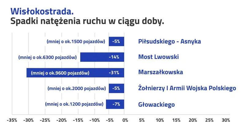 Dane, na które powołuje się Konrad Fijołek, pochodzą z Systemu Obszarowego Sterowania Ruchem Drogowym. Wynika z nich, że na ulicy Marszałkowskiej natężenie ruchu spadło o 31 proc. (ok. 9 600 pojazdów na dobę mniej), a na Moście Lwowskim ruch spadł o 14 proc., (ok. 6 300 pojazdów na dobę mniej).