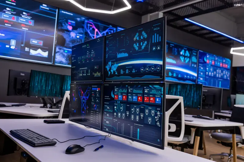 Laboratorium dysponuje 24 w pełni wyposażonymi stanowiskami dla studentów (młodszych analityków SOC). Dodatkowo wyposażone jest w potężny Video Wall złożony z 4 ekranów o przekątnej 115 cali każdy, co daje wrażenie przebywania w centrum kontroli misji kosmicznych. Dlaczego to ważne? To nie dekoracja. To serce SOC, na którym wyświetlany jest "Common Operational Picture" – mapa cyberzagrożeń w czasie rzeczywistym, widoczna dla całego zespołu. Tego nie ma żadna inna uczelnia w Polsce.