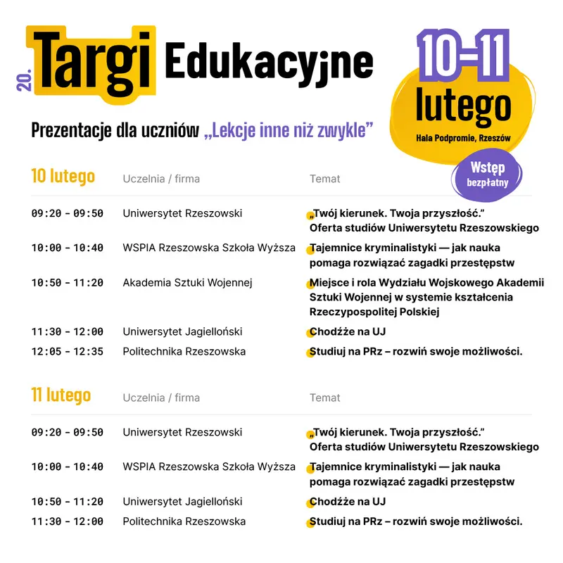 Targi Edu Salon i Work Expo będzie można zwiedzać: 10 lutego w godz. 9:00–14:00, 11 lutego w godz. 9:00–13:00. Oba wydarzenia organizowane są przez Międzynarodowe Targi Rzeszowskie. Wstęp na targi jest bezpłatny.